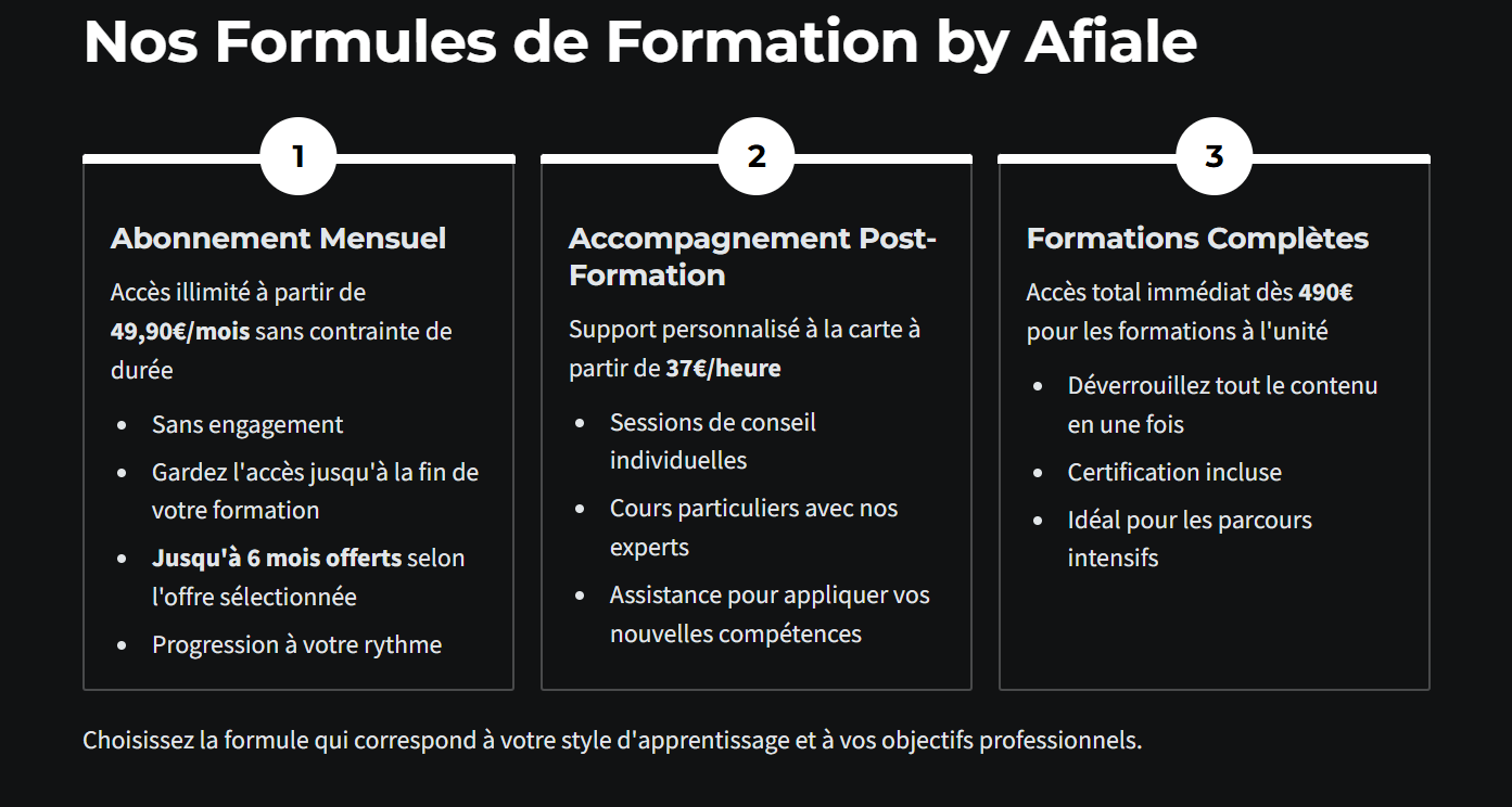 Définissez vos objectifs de développement, optimisez vos ressources et atteignez votre plein potentiel avec nos services de formation, d'accompagnement et de conseils personnalisés. Découvrez comment Afiale peut vous aider à atteindre vos rêves.